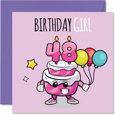 48th Birthday Cards for Women Cake Girl Balloons Happy Card 48 Year Old Woman Sister Wife Niece Daughter, 145mm Bday Greeting
