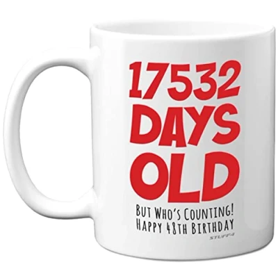 MAKE THEM LAUGH WITH THIS FUNNY BIRTHDAY MUG: If you are looking for funny mugs for work colleagues or secret santa gift under 10 then look no further. This exceptional quality mug shows the design 17532 Days Old But Who's Counting! Happy 48th Birthday. It's bound to make them giggle. Not just for friendship gifts for women this could also be for Mum, Dad, Son, Daughter, Friend, Brother, Sister, Cousin, Auntie or Uncle. WHAT DO YOU GET: This secret santa presents for men or women is made from the highest quality mugs available on the market. An 11oz ceramic gloss finished mug with a large handle for ease of use. The cheeky design is printed on both sides so no one will miss it. Incredibly funny gifts for women and men from Stuff4 Ltd. Funny mugs for women, novelty mugs. Mum birthday gift, 48th birthday gifts, adult birthday gift. PACKED FOR PROTECTION: Every order is packed in a drop proof double walled cardboard Mug Mailer which are lightweight and strong enough to provide total protection. So have the work colleague or your best friend in pieces with these funny birthday gifts and not the rude mugs. Coffee mugs for men, funny cups, 48th birthday present funny, happy birthday Dad gift, 48th birthday gifts for men. MADE AND QUALITY CHECKED IN THE UK: We manufacture all our product right her in the UK so you can be sure of a fast turnaround and a product that is expertly made - Great Dad or Mum birthday gifts from Son or Daughter. Mum 48th birthday gift, birthday cards for brother, rude birthday cards for men, 48th gift, birthday presents for brother, rude birthday gifts for men, 48th birthday present Mum, sister 48th birthday gift. 11oz DISHWASHER AND MICROWAVE SAFE MUGS: Made from premium ceramic our 11oz heavyweight mugs are manufactured with a dishwasher safe premium coating. This means that the colours of your image will not fade from even after multiple cycles (up to 800) through a dishwasher and they are also microwave safe. Rude birthday gifts for women, funny birthday gift for her, brother 48th birthday gift, funny male birthday presents.