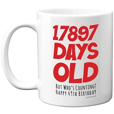 MAKE THEM LAUGH WITH THIS FUNNY BIRTHDAY MUG: If you are looking for funny mugs for work colleagues or secret santa gift under 10 then look no further. This exceptional quality mug shows the design 17897 Days Old But Who's Counting! Happy 49th Birthday. It's bound to make them giggle. Not just for friendship gifts for women this could also be for Mum, Dad, Son, Daughter, Friend, Brother, Sister, Cousin, Auntie or Uncle. WHAT DO YOU GET: This secret santa presents for men or women is made from the highest quality mugs available on the market. An 11oz ceramic gloss finished mug with a large handle for ease of use. The cheeky design is printed on both sides so no one will miss it. Incredibly funny gifts for women and men from Stuff4 Ltd. Funny mugs for women, novelty mugs. Mum birthday gift, 49th birthday gifts, adult birthday gift. PACKED FOR PROTECTION: Every order is packed in a drop proof double walled cardboard Mug Mailer which are lightweight and strong enough to provide total protection. So have the work colleague or your best friend in pieces with these funny birthday gifts and not the rude mugs. Coffee mugs for men, funny cups, 49th birthday present funny, happy birthday Dad gift, 49th birthday gifts for men. MADE AND QUALITY CHECKED IN THE UK: We manufacture all our product right her in the UK so you can be sure of a fast turnaround and a product that is expertly made - Great Dad or Mum birthday gifts from Son or Daughter. Mum 49th birthday gift, birthday cards for brother, rude birthday cards for men, 49th gift, birthday presents for brother, rude birthday gifts for men, 49th birthday present Mum, sister 49th birthday gift. 11oz DISHWASHER AND MICROWAVE SAFE MUGS: Made from premium ceramic our 11oz heavyweight mugs are manufactured with a dishwasher safe premium coating. This means that the colours of your image will not fade from even after multiple cycles (up to 800) through a dishwasher and they are also microwave safe. Rude birthday gifts for women, funny birthday gift for her, brother 49th birthday gift, funny male birthday presents.