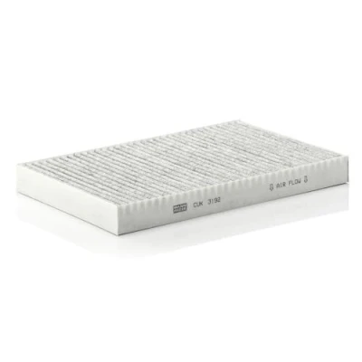 MANN-FILTER Cabin Air Filter CUK 3192 / Cabin air filter with active charcoal / Dimensions (mm): H = 30 ; A = 310 ; B = 194 / Premium Filter in original equipment quality High-quality MANN-FILTER cabin filters with active carbon - nearly 100% protection from particles like pollen, diesel soot & tire abrasion / Additional protection from harmful gases & unpleasant odour The trated highly-effective activated carbon gives protection against harmful gases such as ozone, nitrogen oxide or sulphur dioxide and eliminates unpleasant odours during the entire service interval Looking to find the correct filter? Select: brand, model, vehicle type, and engine type above to see which one fits your vehicle MANN+HUMMEL complies with REACH-regulation + supports the goal of Improved Health and Safety through the design, manufacturing, usage, disposal and recycling of our products