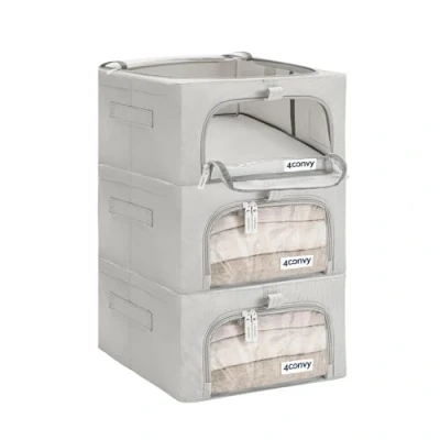 Sturdy as a wardrobe. You don't need a wardrobe. You can arrange the storage boxes as you like: in the outermost corner of the attic, in column shape or even pyramids. The steel frame makes the clothes boxes very stable. They are stackable over 2 metres and they will not tip over and the clothes inside will not be creased Resistant to moisture, dirt and insects. We know that you will use our storage bags in the basement, attic or other harsh conditions, so we made them from the material that is also used for tents, backpacks or garden covers. The fabric (Oxford 600D) protects against moisture and dirt in various shapes. The zips make it moth-proof and protect from dust Instant access The 4CONVY foldable storage bags with transparent top flap are particularly suitable for things that are stored vertically, such as clothes or books. Thanks to the two transparent windows that can be opened, you can see the contents and have instant access to them. The front window allows you to take things out of the inside without having to rearrange the entire stack of clothes storage. Optimal size (32 x 42 x 18 cm). This model is particularly suitable for deeper cabinets and shelves in the wardrobe. It is ideal for storing clothes, accessories as well as toys and camping gear. 100% satisfaction or money back. If you don't like our storage bags, we will refund your money without asking any questions. No risk