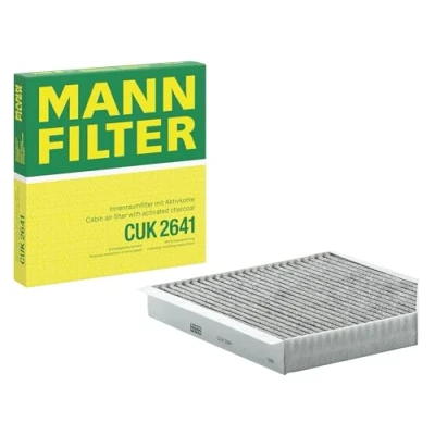 MANN-FILTER Cabin Air Filter CUK 2641 / Dimensions (mm): A = 253; B = 256; H = 35 / Premium Filter in Original Equipment Quality High-quality MANN-FILTER cabin filters with active carbon - nearly 100% protection from particles like pollen, diesel soot & tyre abrasion / Additional protection from harmful gases & unpleasant odour The trated highly-effective activated carbon gives protection against harmful gases such as ozone, nitrogen oxide or sulphur dioxide and eliminates unpleasant odours during the entire service interval Looking to find the correct filter? Select: brand, model, vehicle type, and engine type above to see which one fits your vehicle MANN+HUMMEL complies with REACH-regulation + supports the goal of Improved health and safety through the design, manufacturing, usage, disposal and recycling of our products