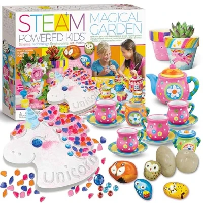 Take your great craft idea outdoors! Create magical gardens with your friends with this jumbo kit which makes a beautiful collection of garden party decorations A giant craft kit to create garden themed decorations Paint Your Own Flower Pots, My Little Garden Pet Rocks, Unicorn Stepping Stone and a 13 piece mini tea set! Encourage your child to get creative with this set of 4 garden themed activities This set contains -13-piece porcelain mini tea set, 4 smooth stones, 2 terracotta flower pots, 2 paint strips, 1 paintbrush, 1 bag of plaster powder, 1 unicorn blister mould, 1 large gem stone, 6 small gem stones in 2 colours, 1 carving tool, 1 glow-in-the-dark star, as assortment of plastic mosaic pieces, 2 coloured sand straws, 1 bag of EVA glue, 1 transparent sticker, Manufacturer: 4M