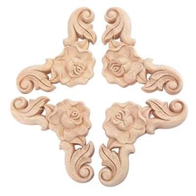 4Pcs Wooden Carved Rose Appliques Onlays, Unpainted Carvings Decals for Cabinet Drawer Wall Headboard Dresser Mirror Pew Cupboard etc Furniture Decoration(8x8cm/3.15"x3.15")