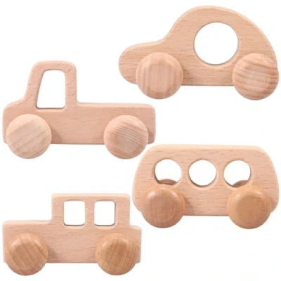 4Pcs Wooden Toys Cars, Vehicles Sensory Grasping Motor Skill Toy, Push and Go First Trucks for Baby 6 to 18 Months, Chewing Toys, Natural Beech Wood Cars Boys Girls Toddlers