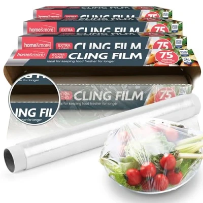 Keeps Food Fresher Longer: Extends foods' freshness with our cling film. Our cling film for food tightly enclose bowls and plates. Perfect for storing and reheating leftovers. Keeping air out with a tight seal and keeping in flavours for longer. Cling Tight Plastic Wrap: Cling Film stretches tight and seals easily to prevent food from splashing the inside of the microwave. Our Cling Film Roll has fantastic holding and sealing power even with repeated use. Keeping odours from seeping out. Tears Off Easily: Cling film dispenser and cutter gives a clean cut for consistent tearing. Sturdy cling film cutter with an easy to use cardboard dispenser. Clingfilm comes off the roll smoothly to cover food in the microwave & to wrap sandwiches. Multipurpose Plastic Wrap: Good quality cling film refill, right thickness and appropriate size for home use. Strong and durable clingfilm to cover plates. This film is microwave-safe and a versatile plastic wrap for all kitchen and household needs. Huge Bundle: Four rolls of 300mm Wide x 75m Long Rolls (300m Total Length). Clingfilm dispenser with cutter bundled together, making it perfect cling film for food preparation or catering