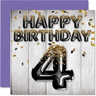 MAKE THEM SMILE WITH THIS AWESOME BIRTHDAY CARD: This exceptional quality birthday card for Him shows the design of black & gold glitter balloons stating 'Happy Birthday 4'. If you are looking for funny birthday cards for Men, then then this happy birthday card is bound to make them laugh. Not just for friendship gifts for Men this could also be for Best Friend, Work Colleague, Dad, Grandpa, Nan, Dad, Grandad, Grandad, Colleague, Brother, Brother, Cousin, Uncle or Uncle. WHAT DO YOU GET: The card is printed on one side and BLANK ON THE INSIDE to allow you to write your very own message. The unique fun design is printed on a specially sourced and environmentally responsible board. At 360 microns thick the natural white one-sided gloss board has a quality look and feel. Supplied with a coloured gummed envelope to complement the design and ready to be sealed and sent in the post. Birthday card for Grandson, 4th birthday card for Him. NO INK SMUDGES: There is nothing worse than writing inside a card to find that the shiny surface makes the ink smudge. This is why we use a high quality one sided coated board. The uncoated side will absorb more of the ink from your pen to make smudging a thing of the past. Grandson birthday cards, Kids birthday card, birthday card cute, 4th birthday gifts for Boys, 4th birthday gifts for Grandson, Little Brother birthday cards. SIZES: Greeting Card = 145mm x 145mm, Envelope = 155mm x 155mm, Card Thickness = 360 micron. Great Son birthday cards from Dad and Dad, male birthday card, 4th birthday card, happy birthday Grandson cards, Niece 4th birthday cards, Cousin birthday card. MADE AND QUALITY CHECKED IN THE UK: We print and manufacture all our product right Him in the UK so you can be sure of a fast turnaround and a product that is expertly made. Using environmentally responsible premium board our card is conscious of the responsible management of the world's forests - Little Brother 4th birthday cards, Goddaughter 4th birthday cards, happy male birthday cards.
