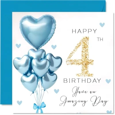 4th Birthday Cards for Boys Blue Glitter Balloons Happy Card 4 Year Old Boy Brother Nephew Son Grandson, 145mm Bday Greeting