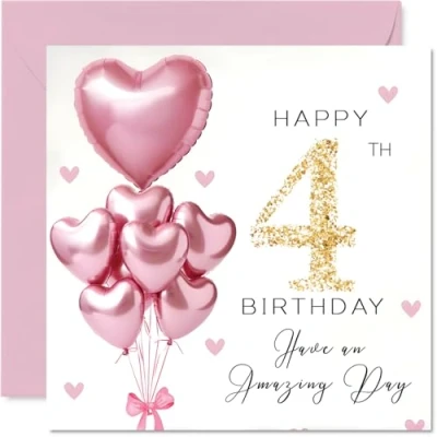 4th Birthday Cards for Girls Pink Glitter Balloons Happy Card 4 Year Old Girl Granddaughter Goddaughter Step Daughter Sister, 145mm Bday Greeting