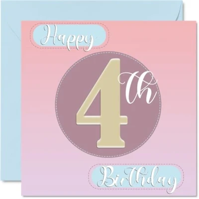 MAKE HER SMILE WITH THIS UNIQUE BIRTHDAY CARD: This exceptional quality birthday card for her shows the design 'Happy 4th Birthday'. If you are looking for special birthday greetings cards for Girls birthday card then then this happy birthday card is bound to make her smile. Not just for birthday gifts for Girls this could also be for Cousin, Daughter, Granddaughter, Niece, Sister, Goddaughter, Step Daughter or Great Niece. WHAT DO YOU GET: The card is printed on one side and BLANK ON THE INSIDE to allow you to write your very own message. The unique fun design is printed on a specially sourced and environmentally responsible board. At 360 microns thick the natural white one-sided gloss board has a quality look and feel. Supplied with a coloured gummed envelope to complement the design and ready to be sealed and sent in the post. Great Cousin birthday cards, 4th birthday card, Daughter birthday card. NO INK SMUDGES: There is nothing worse than writing inside a card to find that the shiny surface makes the ink smudge. This is why we use a high quality one sided coated board. The uncoated side will absorb more of the ink from your pen to make smudging a thing of the past. 4th Birthday card for Granddaughter, 4th Birthday card for Niece, 4th Birthday card for Sister. SIZES: Greeting Card = 145mm x 145mm, Envelope = 155mm x 155mm, Card Thickness = 360 micron. Goddaughter 4th birthday card, birthday cards for Step Daughter, cute birthday cards for Great Niece, 4th birthday card Cousin, Daughter 4th birthday card. MADE AND QUALITY CHECKED IN THE UK: We print and manufacture all our products right here in the UK so you can be sure of a fast turnaround and a product that is expertly made. Using environmentally responsible premium board our card is conscious of the responsible management of the world's forests - perfect birthday cards for Girls, fun birthday cards for her, Daughter 4th birthday cards, female birthday cards.