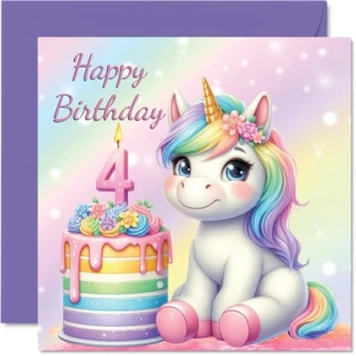 4th Birthday Cards for Girls Unicorn Cake Happy Card 4 Year Old Girl Daughter Niece Cousin Sister, 145mm Bday Greeting