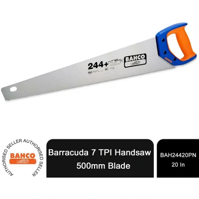 General description The Bahco 244+ Barracuda Handsaw is a high-quality general-purpose hard point saw designed for precise cutting tasks. It features a 20-inch (500 mm) blade suitable for various DIY and home improvement projects, making it ideal for cutting softwood, worktops, chipboard, and MDF. Known for its durability and efficiency, this saw is perfect for both professional and home use. Technical specifications Blade Length: 500 mm (20 in) Tooth Pitch: 7 TPI Weight: approximately 0.4 kg Material: High-quality steel blade Type: Universal hard point Installation Ensure the saw blade is properly secured in the handle before use. Check that the blade is clean and free of damage prior to cutting. Usage Use with a steady, controlled motion for accurate cuts. Wear safety gloves and eye protection during use. Cut along marked lines for best results. Other information
