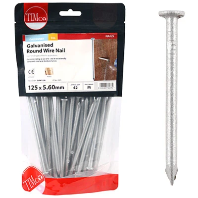 General description Timco Galvanised Round Wire Nails are designed to create a strong bond between pieces of wood, making them ideal for rough carpentry projects where the nails will not be visible. These nails are suitable for medium-duty rust protection and are perfect for clamping applications. Technical specifications Dimensions: 125 x 5.60 mm Weight: 1 kg Service Class: Complies with Service Class 2 Eurocode: Complies with Eurocode 5 Other information Available in various sizes: 40 x 2.65mm, 50 x 2.65mm, 65 x 2.65mm, 65 x 3.35mm, 75 x 3.75mm, 100 x 4.50mm, 150 x 6.00mm Available in different pack sizes: 0.5 kg, 2.5 kg, 25 kg