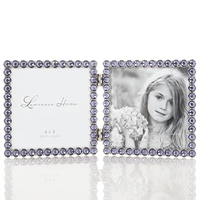 BEAUTIFUL DESIGN This charming and sweet frame has a continuous row of sparkling jewels set in elegant silver metal INCREDIBLE VALUE High quality heavy weight cast metal picture frame made with exceptional workmanship ELEGANT and LUSTROUS METAL FINISH Elevate your home décor with this sophisticated timeless design that will complement any room EASY TO OPEN High quality easy open gray velvet backing and sturdy hinges for table top display PHOTO SIZE Holds two 4 inch by 4 inch photo