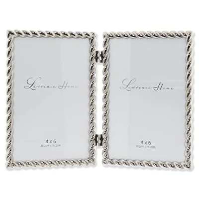 DESIGNER FRAME: Heavyweight cast metal picture frame with rope design. INCREDIBLE VALUE: High quality heavy weight cast metal picture frame made with exceptional workmanship ELEGANT and LUSTROUS METAL FINISH: Elevate your home décor with this sophisticated timeless design that will complement any room EASY TO OPEN AND HANG: High quality easy open black velvet backing for table top display, also includes hangers for wall mounting PHOTO SIZE: Holds two 4 inch by 6 inch photos