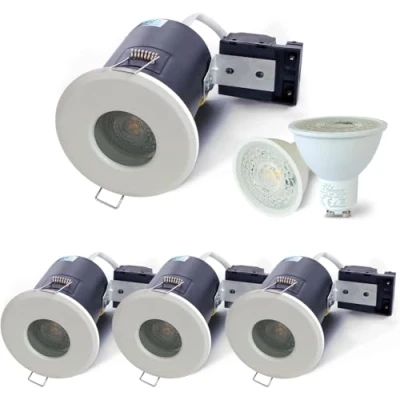 Sleek White Fire-Rated Downlights for Modern Spaces: These stylish white LED downlights seamlessly blend into ceilings, offering a minimalist and modern look. With a compact 86mm diameter and 125mm height, they fit perfectly into 68-75mm cut-out ceilings for a flush. Ideal for kitchens, bathrooms, and commercial spaces Superior Fire Water Resistance for Safety: Engineered with 90-minute fire-rated protection and IP65 waterproof sealing, these downlights are built to withstand wet and high-risk environments. The die-cast aluminum housing and heat dissipation design ensure durability and long-lasting performance Bright Energy-Efficient Cool White Lighting: Includes 4x 5W GU10 LED bulbs (6000K cool white) delivering 430 lumens each—equivalent to 50W halogen but with 90% energy savings. The 38° beam angle provides focused, flicker-free illumination, reducing eye strain while enhancing visibility Quick Installation Hassle-Free Maintenance: Pre-wired with a ceramic lampholder and spring clips for fast, tool-free mounting. Works directly with 220V-240V mains (no transformer needed). The replaceable GU10 bulbs make maintenance effortless—simply swap bulbs when needed Durable Reliable for Long-Term Use: Constructed from high-quality aluminum, these recessed ceiling lights resist corrosion and overheating. Backed by responsive customer support, ensuring peace of mind with every purchase. Perfect for both residential and commercial LED lighting projects