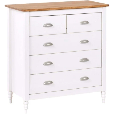 General description Add a touch of elegance and functionality to your bedroom with this stylish chest of drawers. The body, legs, and top are crafted from robust pine wood, ensuring long-lasting quality, while the handles are made of zamak, a durable zinc alloy. Featuring a timeless combination of white and wood, it blends seamlessly with both modern and classic interiors. Five spacious drawers provide ample storage for clothing, accessories, or household essentials, helping you keep everything neatly organized. The sturdy top offers a perfect surface for decorative accents, a lamp, or personal items, making this chest of drawers a practical yet sophisticated addition to any home. Technical specifications Product Type: Chest of Drawers Style: Scandinavian General Color: White, Silver, Brown Main Material: Pine Wood Additional Material: Zamak Legs Material: Wood Top Material: Wood Doors Opening: Standard Number of Drawers: 5 Dimensions: Depth: 40 cm, Width: 79 cm, Height: 83 cm Weight: