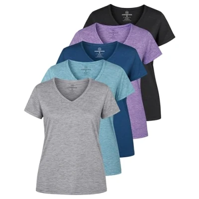 5 Pack: Womens V Neck T Shirt Ladies Yoga Top Athletic Tees Active Wear Gym Workout Zumba Exercise Running Essentials Quick Dry Fit Dri Moisture Wicking Basic Clothes Set 1,L