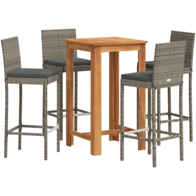 ManoManoGeneral description This 5 Piece Garden Bar Set features an elegant and contemporary design, making it an excellent choice for dining or relaxing in your garden. The set includes a sturdy bar table and four comfortable bar stools, perfect for outdoor gatherings. Technical specifications Bar table: Material: Solid acacia wood with an oil finish Dimensions: 60 x 60 x 105 cm (L x W x H) Bar stool: Colour: Grey Material: PE rattan, powder-coated steel Dimensions: 40 x 44 x 108 cm (W x D x H) Seat height from the ground (without cushion): 76 cm Cushion: Colour: Anthracite Cover material: Fabric (100% polyester) Dimensions: 40 x 37 x 4 cm (W x D x T) Maximum weight capacity: 110 kg per seat Compatibility and accessories Delivery contains: 1 x Bar table 4 x Bar stool 4 x Seat cushion with removable and washable cover Installation Assembly required: Yes Usage To maintain the beauty of your outdoor furniture, it is recommended to protect it with a waterproof cover. Be aware of the risk of open