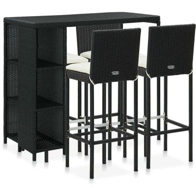 General description This 5 Piece Garden Bar Set with Cushions features an elegant design that will serve as the focal point of your garden, patio, or terrace. Made from weather-resistant and waterproof PE rattan, this bar set is easy to clean, durable, and suitable for daily use. The powder-coated steel frame ensures that the table and stools are sturdy and long-lasting. With a lightweight construction, all items are easy to move, and the thick, removable seat cushions provide exceptional comfort. Technical specifications Colour: Black Cushion colour: Cream Material: Poly rattan, powder-coated steel, fabric (100% polyester) Table dimensions: 120 x 60 x 110 cm (L x W x H) Stool dimensions: 40 x 44 x 108 cm (W x D x H) Maximum weight capacity: 110 kg per seat Weather resistant Assembly required: Yes Delivery contains: 1 x Bar table, 4 x Bar stools, 4 x Seat cushions Usage To extend the life of your outdoor furniture, it is recommended to clean it regularly and avoid leaving it outdoors