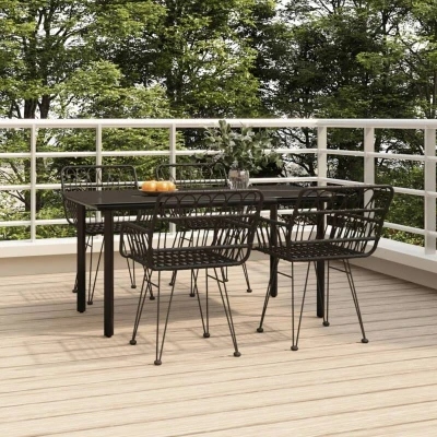 ManoManoGeneral description Create a compelling and cohesive aesthetic in your outdoor space with this 5 Piece Garden Dining Set. Made from durable PE rattan, also known as poly rattan, this set is weather resistant and easy to clean, ensuring it remains beautiful for a long time. The sturdy steel frame provides stability for daily outdoor use, while the tempered glass tabletop offers a practical and smooth surface for meals and drinks. The dining chairs are designed with backrests and armrests for added comfort. Technical specifications Table: Colour: Black Material: Powder-coated steel, tempered glass Dimensions: 160 x 80 x 74 cm (L x W x H) Chair: Colour: Black Material: Steel, polyethylene with a rattan look Dimensions: 56 x 64 x 80 cm (W x D x H) Seat size: 44 x 46 cm (W x D) Seat height: 47 cm Armrest height: 64 cm Maximum weight capacity: 110 kg per seat Delivery contains: 1 x Table 4 x Chair Other information Each product comes with an assembly manual in the box for easy assembly. To