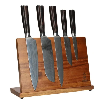 Shinrai KnivesTake advantage of this razor-sharp combination deal and benefit from a big discount! This combination deal contains a 5-piece knife set from Damask Print Series + a magnetic knife block. This combination is a real eye-catcher in the kitchen and ensures that your new favorite knives are stored in a stylish way. This acacia wood knife block comes with 5 knives from the Damask Print Series that are suitable for various cutting tasks in the kitchen. The combination of the hand-crafted blade made of high-carbon steel and acacia wood knife block will really make the knives stand out. The set consists of: 1x 5-piece knife set from Damask Print Series * Made from high carbon steel * Hardened to 60 HRC Rockwell 1x Magnetic knife block acacia wood * Durable and strong * Sturdy * Practical and elegant The prices mentioned include a €40 discount. Beautiful and unique Shinrai knives. People who cut a lot probably suffer from this sometimes. Knives that become blunt very quickly and blades where the cut food always sticks to the knife. With this razor-sharp knife set from Shinrai, that is a thing of the past. The handmade steel blade extends into a beautiful pakka wood handle. The knives from Shinrai are unique as most of them are made by hand. Forged from High Carbon steel, making the knives hard and very sharp. A beautiful and durable knife set that cannot be missing in your kitchen. * High-quality high carbon steel * Beautiful damask print on the blade * Razor sharp 5-piece knife set * Comes in a luxurious gift box * The best in its price range Comfortable All knives are extremely sharp. The perfect balance makes them fit comfortably in your hand. Cutting food has never been so much fun! Handmade in detail Because the knives are handmade, every detail can be carefully examined every time. This way you get the best quality knives. Perfect grip The handles are made of high quality Pakka wood. This is a type of hardwood with a characteristic dark texture. This creates the perfect grip. A second advantage of the blade is the bolster. This does not extend all the way to the edge, but it does clearly separate the handle from the blade. This provides extra safety while cutting, which is nice! A beautiful gift The knives are always delivered in a beautiful gift box. This not only ensures that the knives are protected along the way, but also that it puts a smile on your face when you receive it.