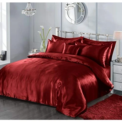 5 Piece Satin Sheets Super Soft Shiny Bedding Sets, 1 x Duvet Cover, Fitted Bed Sheet, 4 Pillow Cases, Cushion Full Complete Set (Red, Single)