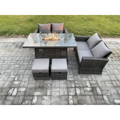 General description This PE rattan outdoor gas fire pit dining table sofa set is an excellent addition to your patio or garden. It is constructed from high-quality PE rattan and durable galvanized steel, ensuring sturdiness and longevity. This garden furniture set is designed for outdoor use all year round. Technical specifications Dining table with fire pit dimensions: 140L x 80W x 69H cm Small footstool dimensions: 40L x 40W x 37H cm (2 pieces) 2-seater sofa dimensions: 124L x 70W x 74H cm (2 pieces) Seat cushion thickness: 8 cm Material: Dark grey mixed rattan with dark grey fabric 5 mm thickness transparent tempered glass with suckers on the surface to prevent sliding Installation The furniture set comes flat packed and is easy to assemble. Please ensure to follow the assembly instructions carefully. Usage For optimal safety, place the gas fire pit on the glass top and not underneath it. Avoid covering the igniter with lava rocks. It is recommended to use a 5 kg gas tank. Before