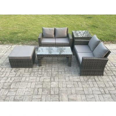 General description This 5-piece deluxe rattan sofa set is an excellent addition to your patio or garden. Made from high-quality PE rattan and durable galvanized steel construction, it offers sturdiness and long-lasting durability, making it suitable for outdoor use all year round. Technical specifications Set includes: 1 side coffee table, 1 big footstool, 2 two-seater sofas, and 1 coffee table Side coffee table dimensions: 65L x 65W x 66H cm Big footstool dimensions: 65L x 65W x 34H cm Two-seater sofa dimensions: 124L x 70W x 74H cm Coffee table dimensions: 105L x 50W x 48H cm Seat cushion thickness: 8 cm Material: PE rattan, galvanized steel frame, 5mm thick clear tempered glass Installation Items come flat-packed; self-assembly is required. Usage Low maintenance; removable cushion covers for easy cleaning. Recommended to keep cushions indoors or use a rain cover when not in use. Use a rain cover for the furniture if not in use for an extended period. Other information Dark grey