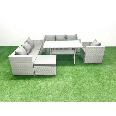 General description This deluxe rattan sofa set is an excellent addition to your patio or garden. It is made of high-quality PE rattan and features a durable galvanized steel construction, ensuring sturdiness and longevity. This furniture set is designed for outdoor use all year round. Technical specifications Set Dimensions: 2 x Sofa with double armrest: 177W x 65D x 66H cm 1 x Armchair: 74L x 65W x 66H cm 1 x Big footstool: 65L x 65W x 34H cm 1 x Rectangular Dining Table: 140L x 80W x 69H cm Color: Light grey mixed rattan with dark grey fabric Seat Cushion Thickness: 8 cm Installation Items come flat packed and are easy to assemble. Sturdy galvanized steel tube metal frames with powder coating to prevent rust. Usage Low maintenance with removable cushion covers. Recommended to keep cushions indoors or use a rain cover when not in use. Keep the furniture covered if not used for a long time. Other information 5mm thickness transparent tempered glass with suckers on the surface to