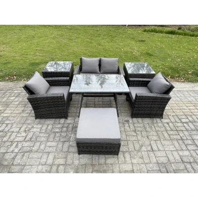 5 Seater Outdoor Garden Furniture High Back Rattan Sofa Dining Table Set with 2 SideTables Big Footstool Dark Grey Mixed Fimous