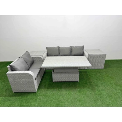 General description This deluxe garden furniture set enhances the aesthetic of your courtyard, deck, backyard, porch, or swimming pool. Constructed from high-quality PE rattan and durable galvanized steel, it is designed to withstand adverse weather conditions in the UK. The set can be easily reconfigured to meet your needs at any time. Technical specifications 1 x Love Sofa Size: 124W x 67D x 79H cm 1 x 3 Seater Sofa Size: 177W x 67D x 79H cm 2 x Side Tables Size: 65L x 65W x 66H cm 1 x Lifting Table Size: 140L x 80W x 68/48H cm (height adjustable: up 68 cm, down 48 cm) Seat Cushion Thickness: 8 cm Material: Light grey PE rattan with dark grey fabric Glass Tabletop: 5 mm thickness transparent tempered glass Installation Items come flat packed and are easy to assemble. The furniture features sturdy galvanized steel tube frames with powder coating to prevent rust. Usage For optimal maintenance, keep the cushions indoors or use a rain cover when not in use. It is recommended to cover