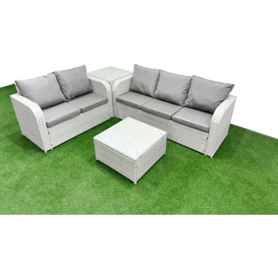 General description This deluxe garden furniture set enhances the decor of your courtyard, deck, backyard, porch, or swimming pool. Constructed with high-quality PE rattan and durable galvanized steel, it is designed to withstand adverse weather conditions in the UK. The set can be easily rearranged into different configurations to suit your needs. Technical specifications 1 x Love Sofa Size: 124W x 67D x 79H cm 1 x 3 Seater Sofa Size: 177W x 67D x 79H cm 1 x Side Table Size: 65L x 65W x 66H cm 1 x Square Coffee Table Size: 65L x 65W x 34H cm Seat Cushion Thickness: 8 cm Material: Light grey PE rattan with dark grey fabric Glass Thickness: 5 mm tempered glass Installation Items come flat packed and are easy to assemble. The furniture features sturdy galvanized steel tube frames with powder coating to prevent rust. Usage Low maintenance is required, with removable cushion covers for easy cleaning. It is recommended to keep the cushions indoors or covered with a rain cover when not in