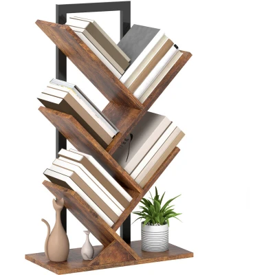 5 Tier Tree Bookshelf with Steel Frame for Living Room, Rustic Brown Homcom