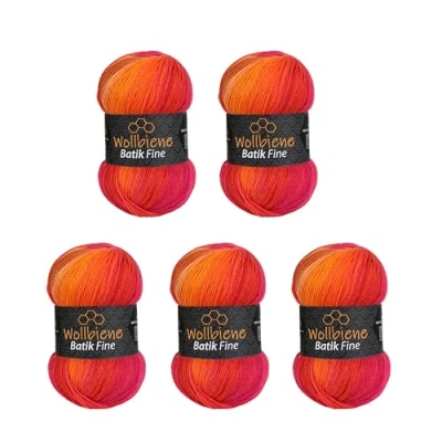 5 x 100 g Wollbiene Batik Fine, 500 Wool with Colour Gradient, Multicoloured Knitting Wool, Crochet (1410 Red Orange)
