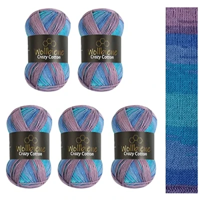5 x 100 g Wollbiene Crazy Cotton Batik, 500 with Colour Gradient, 55% Cotton, Multicoloured Knitting Wool, Crochet All Year Wool (6020 Blue Lilac Turquoise)