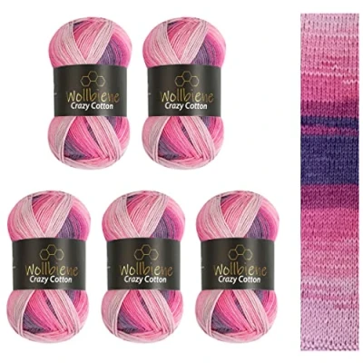 5 x 100 g Wollbiene Crazy Cotton Batik, 500 with Colour Gradient, 55% Cotton, Multicoloured Knitting Wool, Crochet All Year Wool (6040 Berry, Purple, Pink)