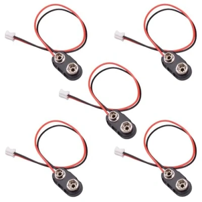 PP3 9V battery clip featuring 150mm length leads and terminated with 2 pin JST compatible connector. Pack of 5