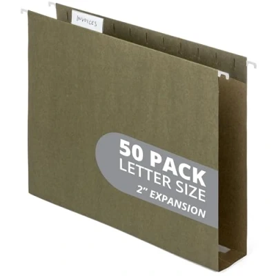 Easily stuff stacks of bulky of files, medical charts, product manuals and more into our 2’’ expanding filing folders, designed to work with standard letter size file cabinets Organize dozens of large and bulky files into one hanging file folder, thanks to our 2’’ bottom square construction and thick cardboard supports No more overflowing hanging files that clog your file cabinet, preventing it from shutting. Our square bottom design allows large files to sit flat, so your files don’t stick out of the top of the file like standard V-shaped hang files Design for neatly organizing your home or office, this 50 pack of extra capacity folders comes with 50 plastic tabs and customizable paper tab inserts so you can get organized right out of the box Reinforced folder will stand up to years of use in busy office environments, with coated metal rod tips that slide smoothly back and forth in the filing cabinet hangers
