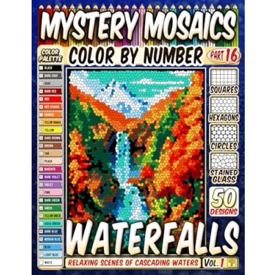 50 Majestic Waterfalls Mystery Mosaic Color by Number: Relaxing Scenes of Cascading Waters in Squares, Hexagons, Stained Glass, and Circles.