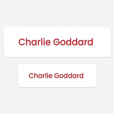 50 x No Iron Medium Personalised Stick On Waterproof Washable Name Labels Great for Clothes, School Uniform, Equipment, Shoes and More. School, Nursery, Day Care, Hospital White with Red Text