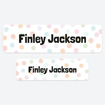 50 x No Iron Personalised Stick On Waterproof Washable Name Labels Great for Clothes, School Uniform, Equipment, Shoes. School, Nursery, Day Care, Hospital Doodle Spots Pastels