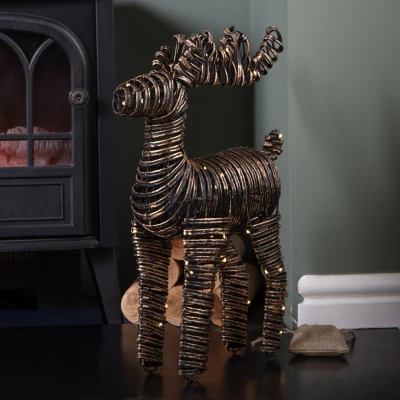 Add a touch of luxury to your seasonal decor with this Light up Christmas Reindeer. A strikingly elegant festive piece designed to captivate. This decorative reindeer is both refined and festive, perfect for placing on mantelpieces, side tables, window ledges, or as a dramatic centrepiece.. Standing 43cm from foot to ear and reaching a total height of 50cm and crafted from premium PET material in sophisticated black and gold tones, this beautifully braided reindeer glows softly with 50 warm white micro LED lights, offering a warm and magical presence to your winter home display. The built in 6 hour on and 18 hour off timer ensures effortless, energy efficient lighting throughout the season. Powered by 3 x AA batteries (not included) with a discreet 30cm lead wire, it’s easy to position anywhere indoors for maximum impact.. Suitable for indoor use only.. Product Specification. Height: 50cm Length: 43cm. 50 Warm White LEDs. Requires 3 x AA Batteries. Timer Function 6 hours on 18 hours off