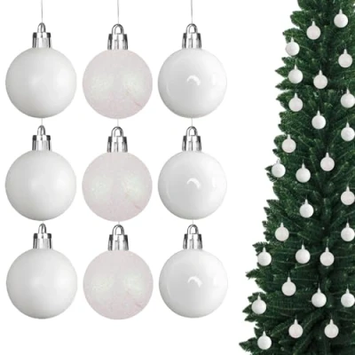 🎄🎅 This pack contains 9 White baubles an assortment of glitter, matte and shiny surface finish. Each bauble measures approximately 5cm and comes with a silver top with a silver string loop attached. 🎄🎅 These Christmas decorations are made of durable plastic to provide a shatterproof, safe finish compared with more traditional glass counterparts. They give the appearance, glitz and glam of glass ornaments without the risk! 🎄🎅 They can also be used to make a garland by threading string or ribbon through the top and hanging them up in the window, from the mantel piece or on the wall. 🎄🎅 Widely used: The durable ball ornaments can be used for indoor & outdoor Christmas decorations, such as Christmas tree, patio, porch 🎄🎅 These Christmassy baubles come in a handy box that they can be stored away in for next year.