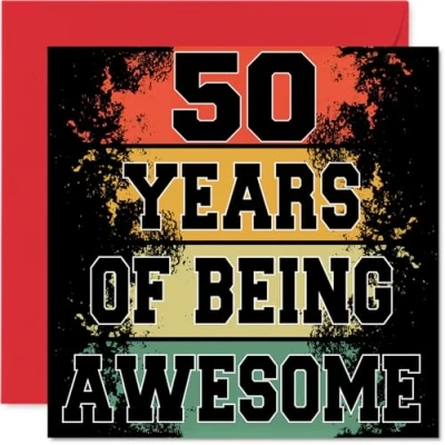 MAKE THEM SMILE WITH THIS UNIQUE BIRTHDAY CARD: This exceptional quality birthday card for him or her shows the design '50 Years Of Being Awesome'. If you are looking for special birthday greetings cards for Men birthday card then then this happy birthday card is bound to make them smile. Not just for birthday gifts for Men this could also be for Grandma, Cousin, Brother, Nanny, Nan, Colleague, Dad or Neighbour. WHAT DO YOU GET: The card is printed on one side and BLANK ON THE INSIDE to allow you to write your very own message. The unique fun design is printed on a specially sourced and environmentally responsible board. At 360 microns thick the natural white one-sided gloss board has a quality look and feel. Supplied with a coloured gummed envelope to complement the design and ready to be sealed and sent in the post. Great Grandma birthday cards, Cousin birthday card. NO INK SMUDGES: There is nothing worse than writing inside a card to find that the shiny surface makes the ink smudge. This is why we use a high quality one sided coated board. The uncoated side will absorb more of the ink from your pen to make smudging a thing of the past. 50th Birthday card for Brother, 50th Birthday card for Nanny, 50th Birthday card for Nan. SIZES: Greeting Card = 145mm x 145mm, Envelope = 155mm x 155mm, Card Thickness = 360 micron. Colleague 50th birthday card, birthday cards for Dad, special birthday cards for Neighbour, 50th birthday card Grandma, Cousin 50th birthday card. MADE AND QUALITY CHECKED IN THE UK: We print and manufacture all our products right here in the UK so you can be sure of a fast turnaround and a product that is expertly made. Using environmentally responsible premium board our card is conscious of the responsible management of the world's forests - perfect birthday cards for Men, fun birthday cards for him, Cousin 50th birthday cards, female birthday cards.
