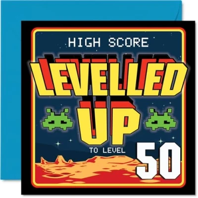 MAKE THEM SMILE WITH THIS UNIQUE BIRTHDAY CARD: This exceptional quality birthday card for him or her shows the design 'High Score LEVELED UP to age level 50'. If you are looking for special birthday greetings cards for Men birthday card then then this happy birthday card is bound to make them smile. Not just for birthday gifts for Men this could also be for Grandma, Cousin, Brother, Nanny, Nan, Colleague, Dad or Neighbour. WHAT DO YOU GET: The cards are printed on both sides with the inside print saying 'Have an Epic Day' and ample space for your own personal message. The unique fun design is printed on a specially sourced and environmentally responsible board. At 360 microns thick the natural white one-sided gloss board has a quality look and feel. Supplied with a coloured gummed envelope to complement the design and ready to be sealed and sent in the post. NO INK SMUDGES: There is nothing worse than writing inside a card to find that the shiny surface makes the ink smudge. This is why we use a high quality one sided coated board. The uncoated side will absorb more of the ink from your pen to make smudging a thing of the past. 50th Birthday card for Brother, 50th Birthday card for Nanny, 50th Birthday card for Nan. SIZES: Greeting Card = 145mm x 145mm, Envelope = 155mm x 155mm, Card Thickness = 360 micron. Colleague 50th birthday card, birthday cards for Dad, special birthday cards for Neighbour, 50th birthday card Grandma, Cousin 50th birthday card. MADE AND QUALITY CHECKED IN THE UK: We print and manufacture all our products right here in the UK so you can be sure of a fast turnaround and a product that is expertly made. Using environmentally responsible premium board our card is conscious of the responsible management of the world's forests - perfect birthday cards for Men, fun birthday cards for him, Cousin 50th birthday cards, female birthday cards.