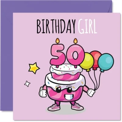 MAKE HER SMILE WITH THIS UNIQUE BIRTHDAY CARD: This exceptional quality birthday card for her shows the design 'Birthday Girl 50'. If you are looking for special birthday greetings cards for Women birthday card then then this happy birthday card is bound to make her smile. Not just for birthday gifts for Women this could also be for Wife, Colleague, Nanny, Cousin, Daughter, Grandma, Friend or Auntie. WHAT DO YOU GET: The card is printed on one side and BLANK ON THE INSIDE to allow you to write your very own message. The unique fun design is printed on a specially sourced and environmentally responsible board. At 360 microns thick the natural white one-sided gloss board has a quality look and feel. Supplied with a coloured gummed envelope to complement the design and ready to be sealed and sent in the post. Great Wife birthday cards, 50th birthday card, Colleague birthday card. NO INK SMUDGES: There is nothing worse than writing inside a card to find that the shiny surface makes the ink smudge. This is why we use a high quality one sided coated board. The uncoated side will absorb more of the ink from your pen to make smudging a thing of the past. 50th Birthday card for Nanny, 50th Birthday card for Cousin, 50th Birthday card for Daughter. SIZES: Greeting Card = 145mm x 145mm, Envelope = 155mm x 155mm, Card Thickness = 360 micron. Grandma 50th birthday card, birthday cards for Friend, cute birthday cards for Auntie, 50th birthday card Wife, Colleague 50th birthday card. MADE AND QUALITY CHECKED IN THE UK: We print and manufacture all our products right here in the UK so you can be sure of a fast turnaround and a product that is expertly made. Using environmentally responsible premium board our card is conscious of the responsible management of the world's forests - perfect birthday cards for Women, fun birthday cards for her, Colleague 50th birthday cards, female birthday cards.