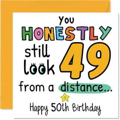MAKE THEM SMILE WITH THIS UNIQUE BIRTHDAY CARD: This exceptional quality birthday card for him or her shows the design 'You Honestly still look 49 from a distance Happy 50th Birthday'. If you are looking for special birthday greetings cards for Men birthday card then then this happy birthday card is bound to make them smile. Not just for birthday gifts for Men this could also be for Grandad, Husband, Grandma, Uncle, Daughter, Nanny, Nan or Sister. WHAT DO YOU GET: The card is printed on one side and BLANK ON THE INSIDE to allow you to write your very own message. The unique fun design is printed on a specially sourced and environmentally responsible board. At 360 microns thick the natural white one-sided gloss board has a quality look and feel. Supplied with a coloured gummed envelope to complement the design and ready to be sealed and sent in the post. Great Grandad birthday cards, Husband birthday card. NO INK SMUDGES: There is nothing worse than writing inside a card to find that the shiny surface makes the ink smudge. This is why we use a high quality one sided coated board. The uncoated side will absorb more of the ink from your pen to make smudging a thing of the past. 50th Birthday card for Grandma, 50th Birthday card for Uncle, 50th Birthday card for Daughter. SIZES: Greeting Card = 145mm x 145mm, Envelope = 155mm x 155mm, Card Thickness = 360 micron. Nanny 50th birthday card, birthday cards for Nan, special birthday cards for Sister, 50th birthday card Grandad, Husband 50th birthday card. MADE AND QUALITY CHECKED IN THE UK: We print and manufacture all our products right here in the UK so you can be sure of a fast turnaround and a product that is expertly made. Using environmentally responsible premium board our card is conscious of the responsible management of the world's forests - perfect birthday cards for Men, fun birthday cards for him, Husband 50th birthday cards, female birthday cards.