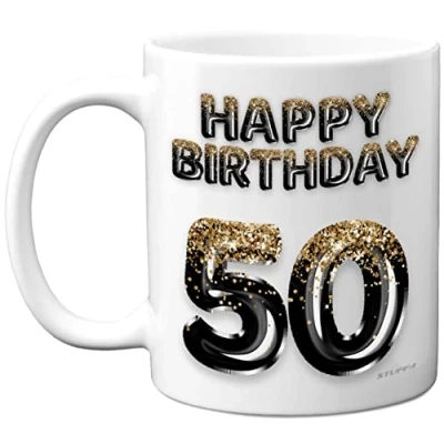 MAKE THEM SMILE ON HIS SPECIAL DAY: This exceptional quality birthday gift for her or him shows the design 'Happy Birthday 50'. If you are looking for funny birthday mugs for women, then then this happy birthday mug is bound to make them laugh. Not just for friendship gifts for women this could also be for Best Friend, Work Colleague, Mum, Grandma, Nan, Dad, Grandad, Nanny, Colleague, Brother, Sister, Cousin, Auntie or Uncle. WHAT DO YOU GET: This novelty mug for him or her is made from the highest quality mugs available on the market. An 11oz ceramic gloss finished mug with a large handle for ease of use. The cheeky design is printed on both sides so no one will miss it. Incredibly funny and thoughtful gifts for women and men from Stuff4 Ltd. PACKED FOR PROTECTION: Every order is packed in a drop proof double walled cardboard Mug Mailer which are lightweight and strong enough to provide total protection. So have the birthday boy in pieces and not the rude mugs, Dad birthday gifts, Uncle birthday gifts, Brother birthday gifts. MADE AND QUALITY CHECKED IN THE UK: We manufacture all our product right her in the UK so you can be sure of a fast turnaround and a product that is expertly made - for his birthday gifts. 11oz DISHWASHER AND MICROWAVE SAFE MUGS: Made from premium ceramic our 11oz heavyweight mugs are manufactured with a dishwasher safe premium coating. This means that the colours of your image will not fade from even after multiple cycles (up to 800) through a dishwasher. They are also microwave safe.