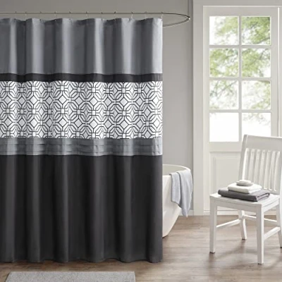 The 510 DESIGN Donnell Embroidered and Pieced Shower Curtain offers a fresh update to your bathroom. A pintucked and pieced design is featured and embroidered geometric design adds texture and dimension. An additional built-in lining provides better drapability and added privacy. 1 Shower Curtain: 72"W x 72"L Machine wash cold, gentle cycle and separately. Do not bleach, tumble dry low. Remove promptly. Do not iron